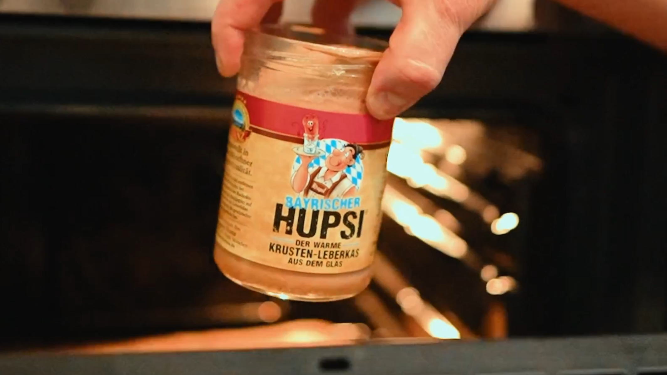 Heize deinen Backofen auf 185 °C vor. Ob du Ober-/Unterhitze oder Umluft wählst, spielt hierbei keine Rolle. Wichtig ist, dass du den HUPSI direkt (ggf. mit Backpapier) auf das Backblech oder den Rost stellst, ohne zusätzliche Schale. Backe den Leberkas für etwa 25 bis 30 Minuten, bis er goldbraun ist und von alleine aus dem Glas hüpft.